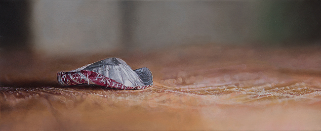 Having seen so many similar images in films, television and adverts, where a close up shot of an object is used to tell a story, sell a product or used as a devise for embellishing a narrative, I have used the exact wide screen cinematic proportions for the paintings of 2.39:1 to hopefully invite the viewer to create their own narrative around the works.  As they look like film stills, it offers the idea of something happening before and after, the objects being used as props, being there for a reason and are not just rubbish that somebody has used and discarded.