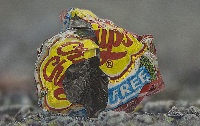 The paintings are of found objects, which are still in situ out in the world after all useful life has been extracted from them.  Their existence, meaning, fascination and purpose, often created by advertising, has been removed.  The objects were the carriers of pleasure and worth but are now just regarded as rubbish.  The paintings reflect what remains when there is nothing left. I see them as metaphors for the human experience, where people are used, consumed and discarded by others. This is reflected in the titles of each painting.