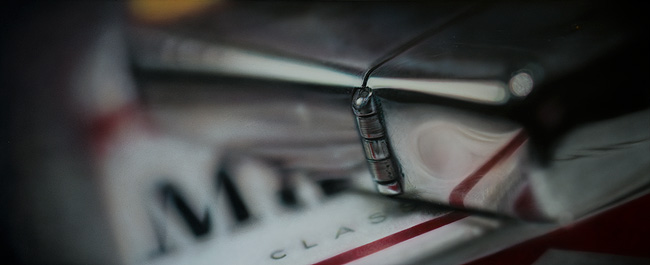 In The Truth Is.... Sometimes I Miss You So Much I can Hardly Stand It, an immaculate vision of a shiny Zippo lighter reflects the iconic black, white and red of a cigarette packet. The sharpness of the focus in the centre and the rushing away of detail into the periphery mean that the painting mimics the panning round of a camera; these are images imbued with movement and a heady intimacy of viewpoint.
