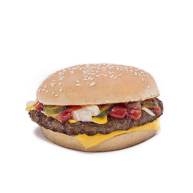 Quarter Pounderâ„¢ with Cheese, 2023 Quarter Beef Patty, Sesame Bun, Cheddar Cheese Slice, Tomato Ketchup, Pickle Slices and Onions. Oil Paint on Linen, 350 x 350mm