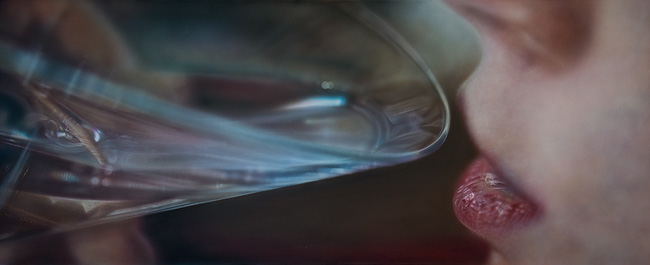 At the end of his garden, his studio is a temporary home to four of six of his latest paintings, the series ‘In a Suspended State’ – at the time of writing, two have already been sold. The series includes In a Suspended State of Happiness, a close-up of a woman’s lipsticked mouth about to sip from a glass of dry Martini. The imminence of the contact between her lips and the elegantly thin bluish glass of the drink is at the heart of the painting; the rest of the detail of the scene slides out of focus.