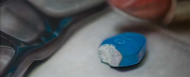 In Still Nothing Compared to what you had on that First Magical Time, a broken Viagra tablet lies on a flat surface, the contrast between its crumbling pristine white interior and gleaming electric blue coating highlighted with dazzling clarity. The title implies a story – a love affair, a regret or a longing for the past. The other weightiness that these paintings are heavy with is the implication of infinity within their conceptual framework. As they mimic film stills, they are potentially innumerable; to pursue the idea, the artist could be perpetually engaged in forever recreating the next still in succession.